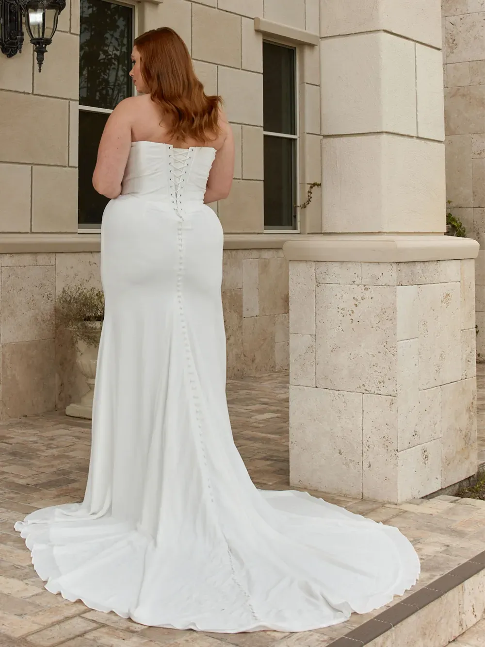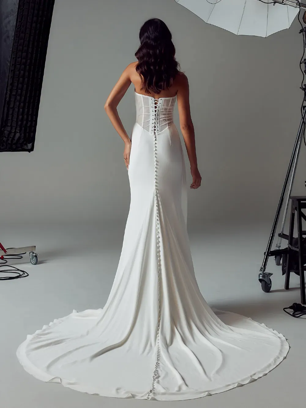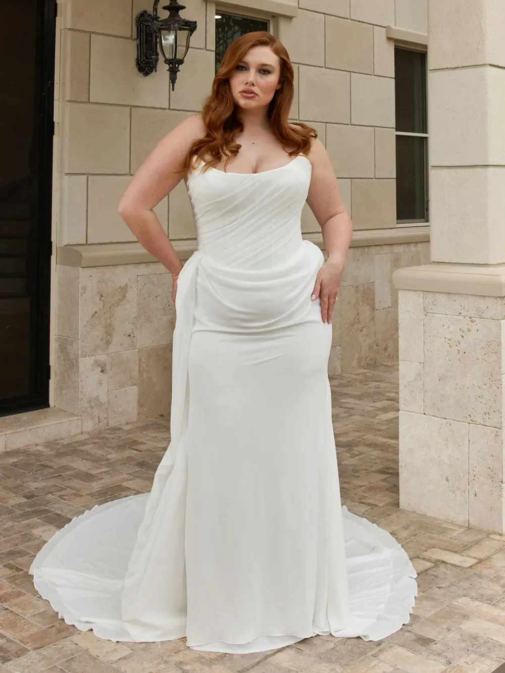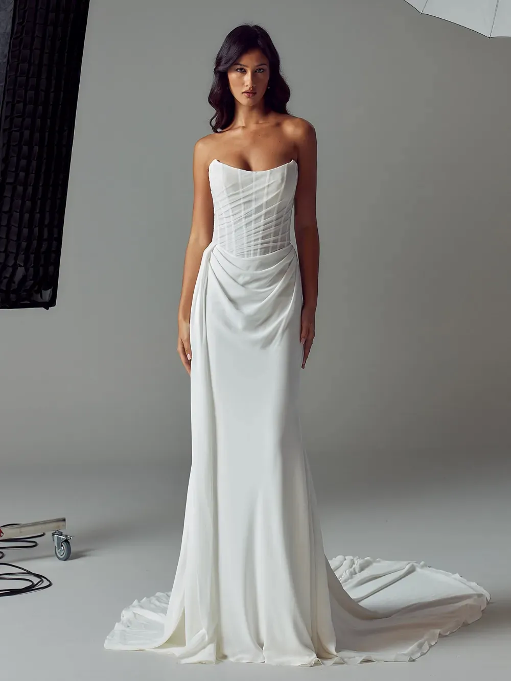 For the bride who loves understated luxury with fashion-forward flair, Valerie by Evie Young blends soft, flowing drapes with sculpted, figure-flattering lines. A modern classic for brides who value both style and simplicity.