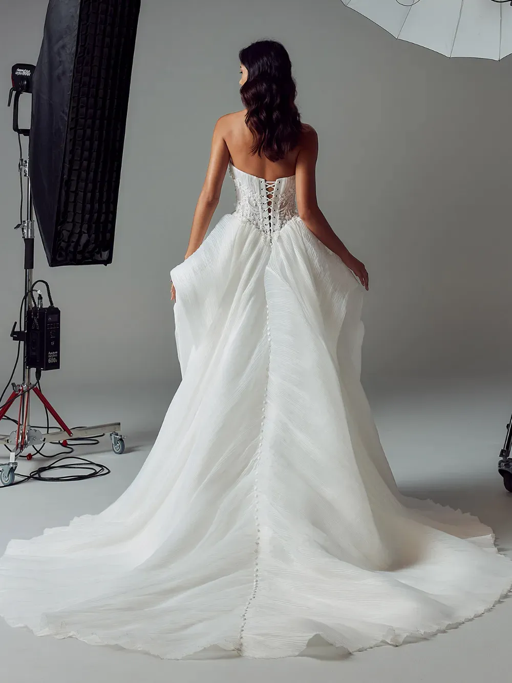 - Lace-up corset back and Basque waist for precise shaping and flattering fit