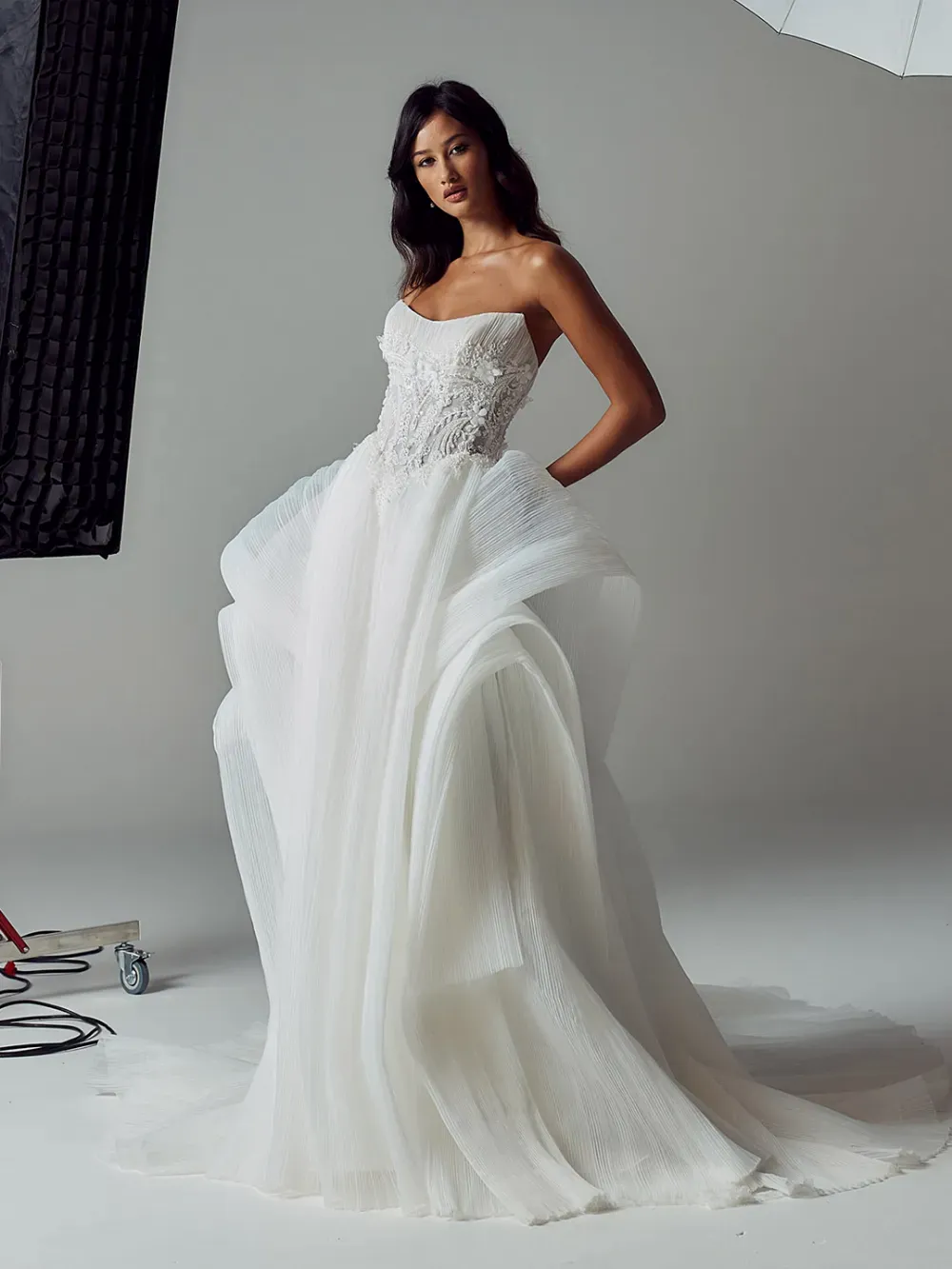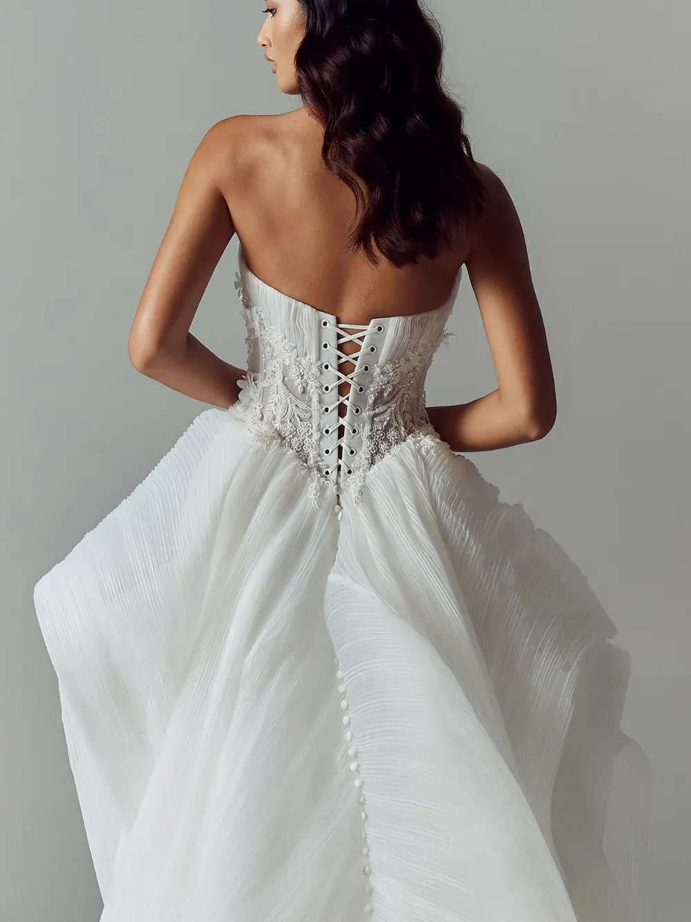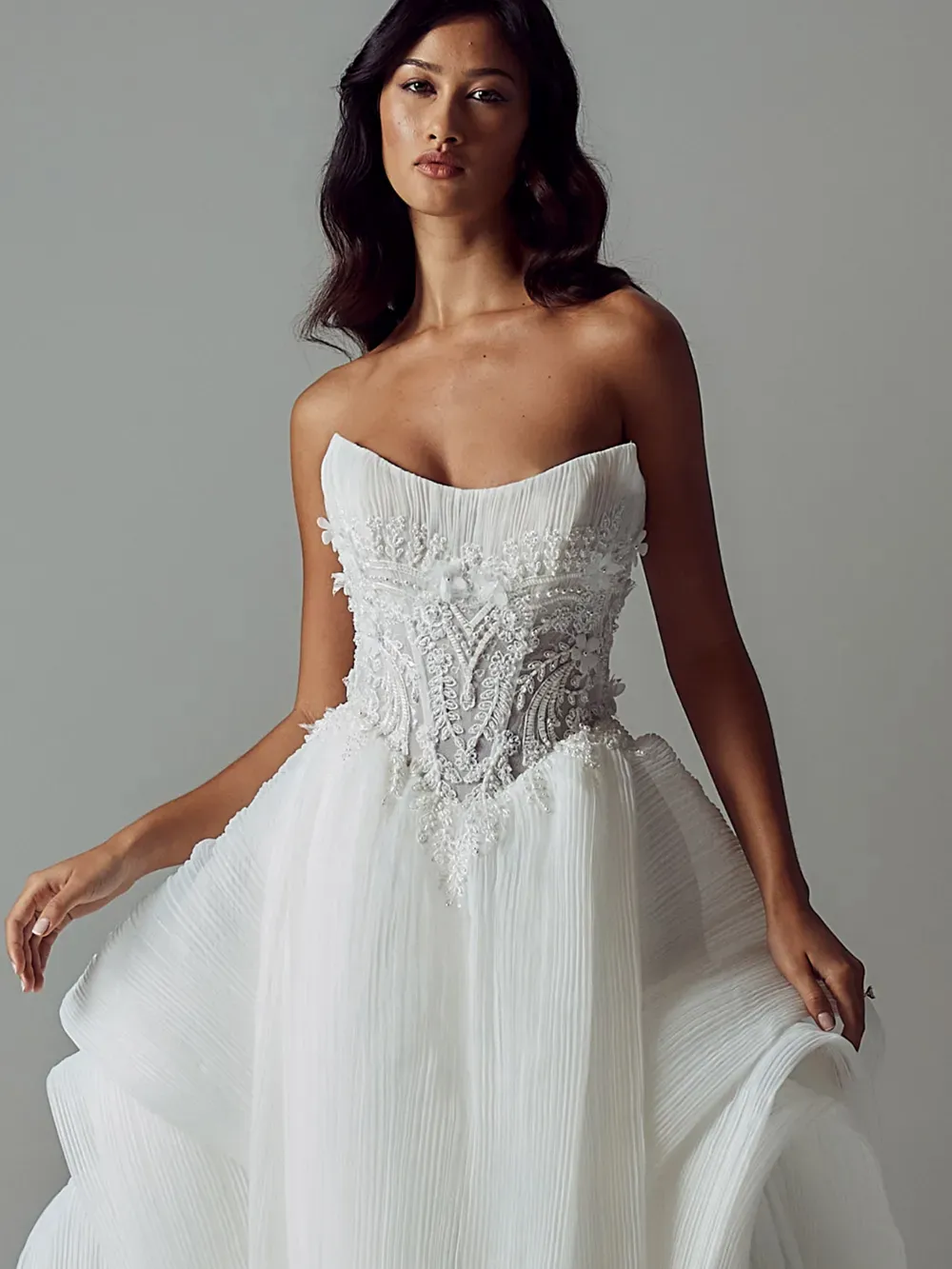 - Pleated bust layered with intricate beaded motifs and 3D florals for rich texture and detail