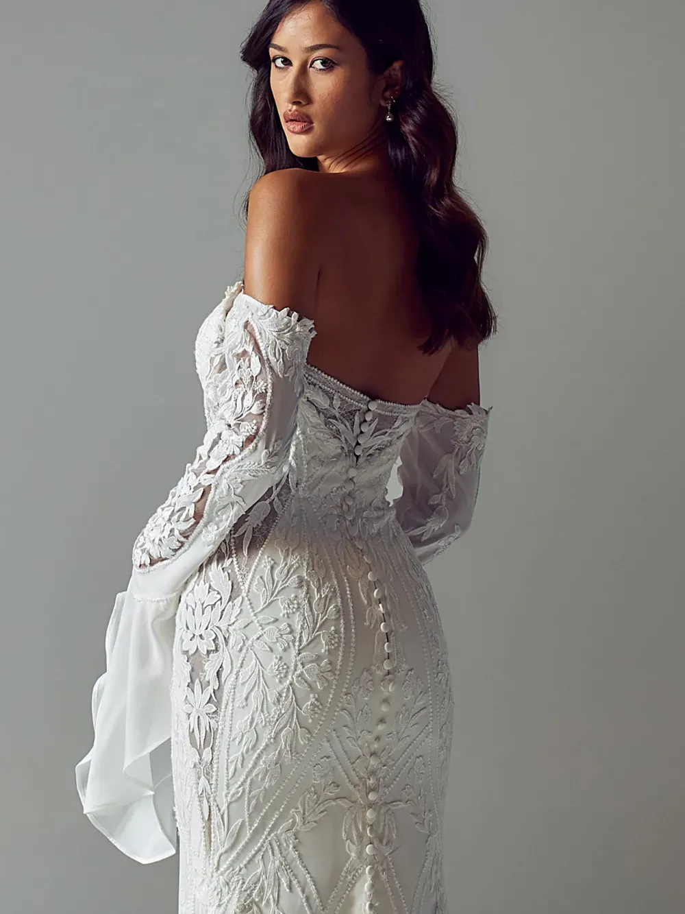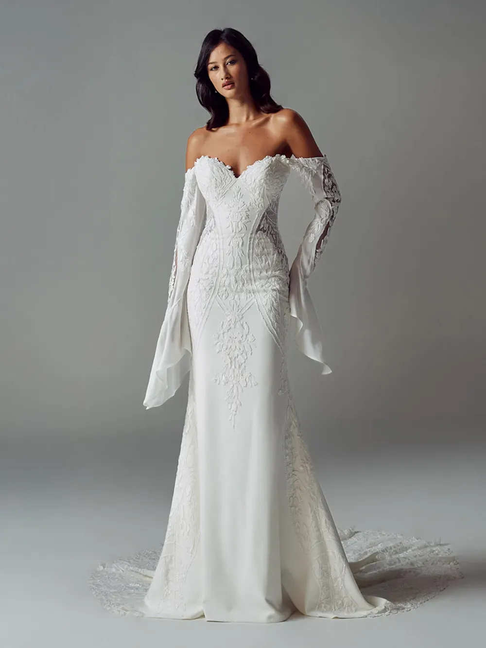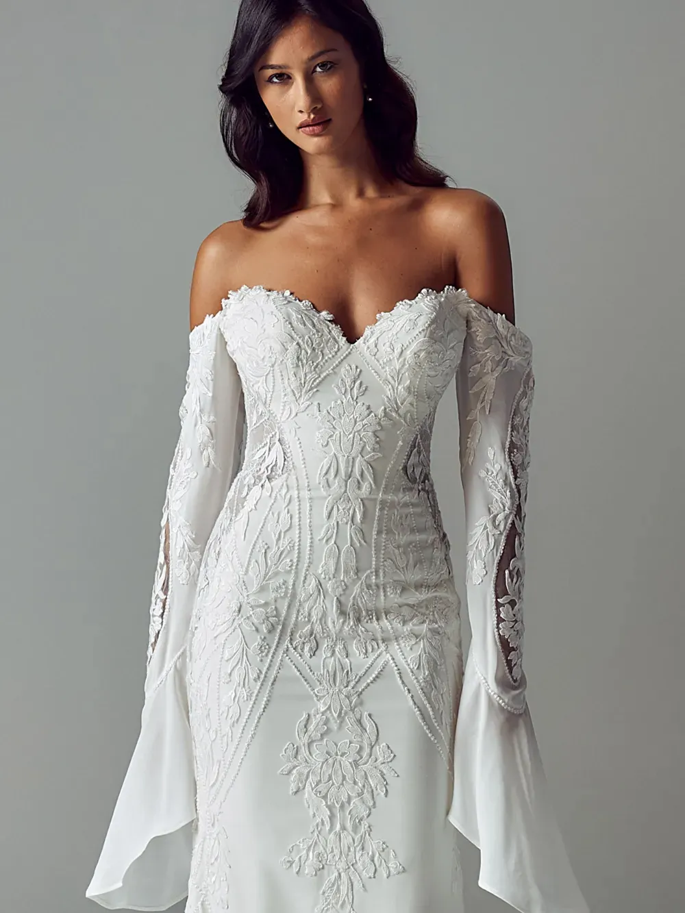 - Sweetheart neckline bodice with detachable off-shoulder lace-illusion flared sleeves for whimsical romance