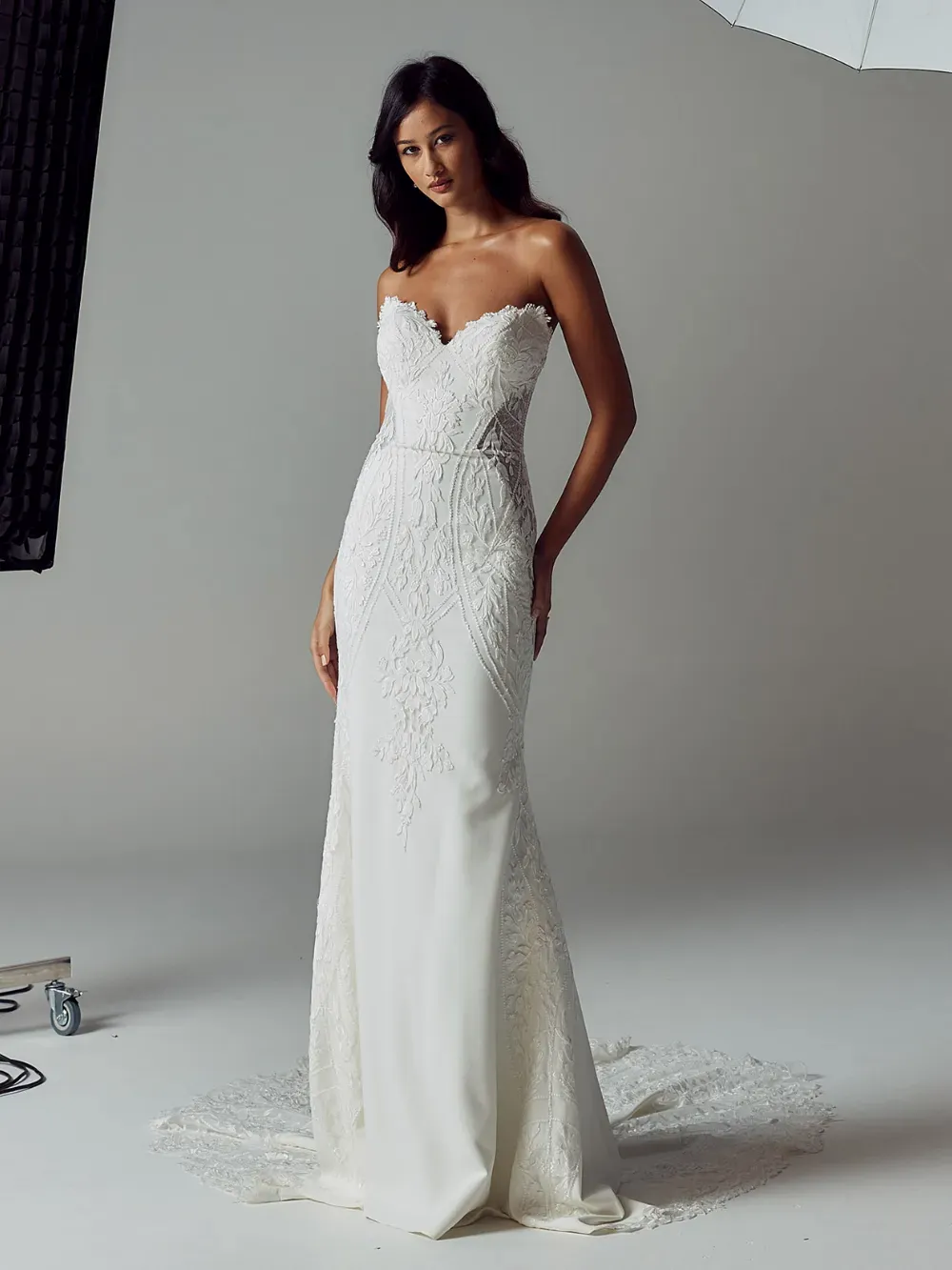 Romantic, fashion-forward, and effortlessly versatile, the Janie by Evie Young combines bold lace with sleek crepe for brides who love free-spirited elegance with modern sophistication.
