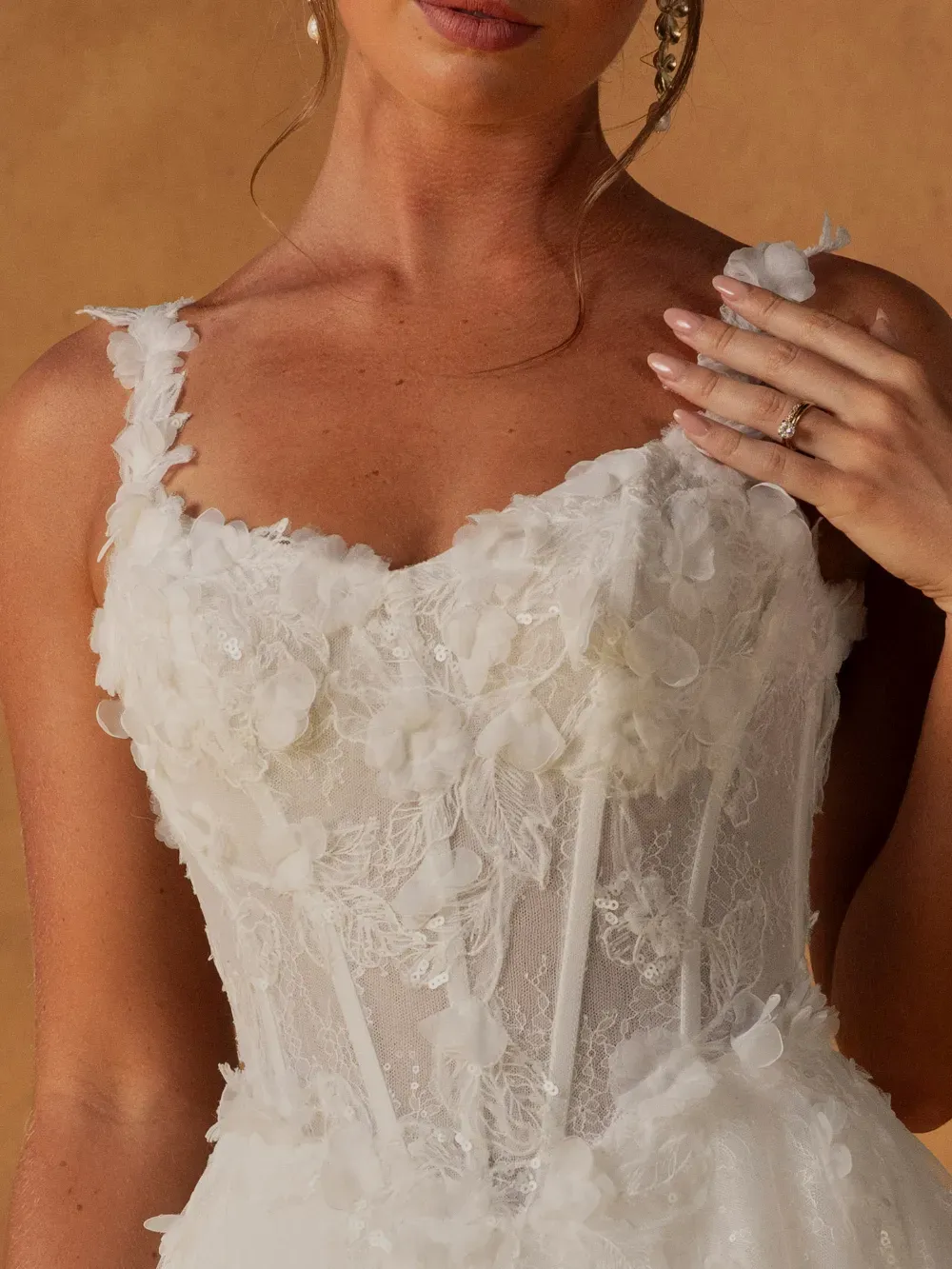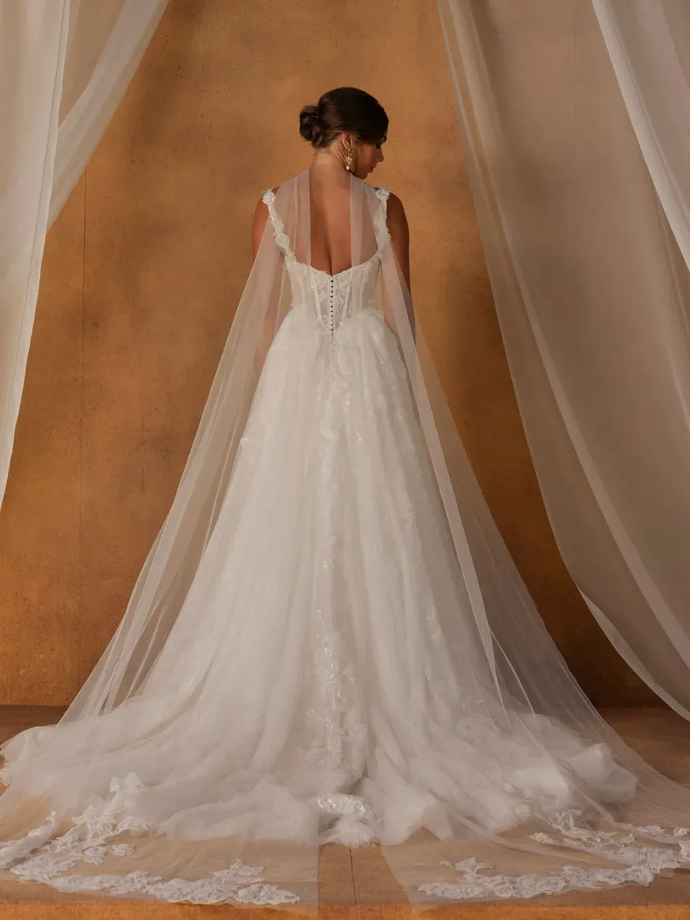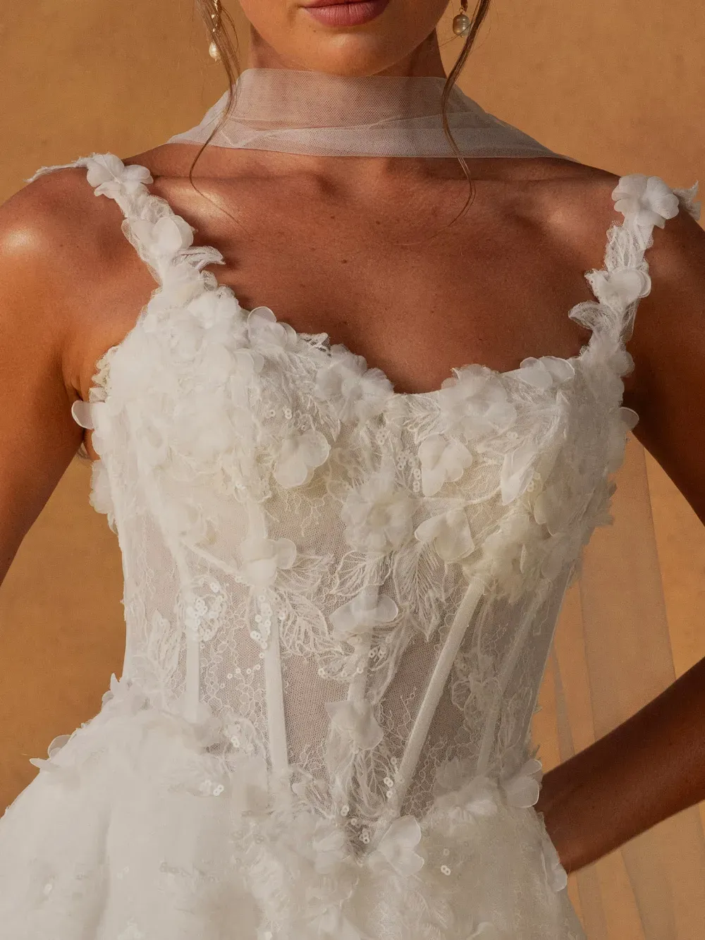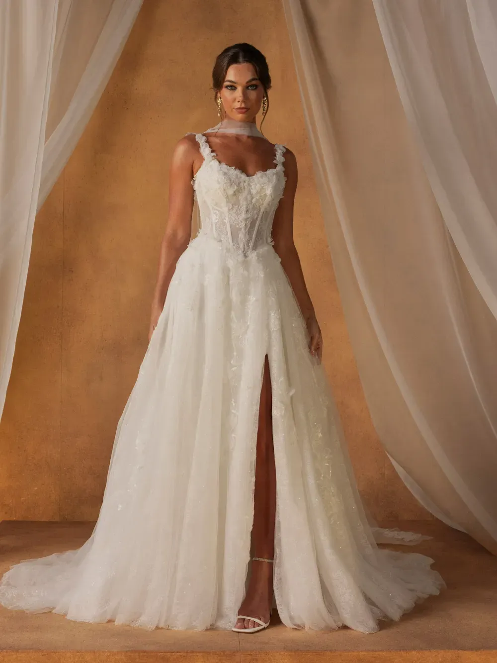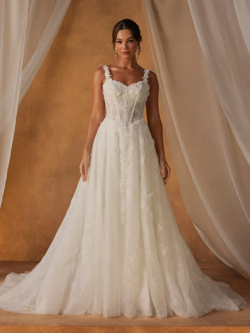 Delicate, romantic, and richly detailed, Nadine by Madi Lane Bridal brings together soft sparkle, layered textures, and intricate lace for a modern yet ultra-romantic bridal look. With sculptural bodice work and airy movement through the skirt, she is crafted for the bride who loves fashion-forward elegance with ethereal charm.
