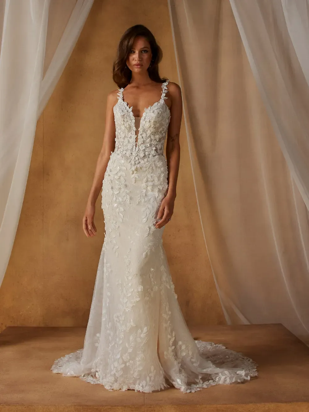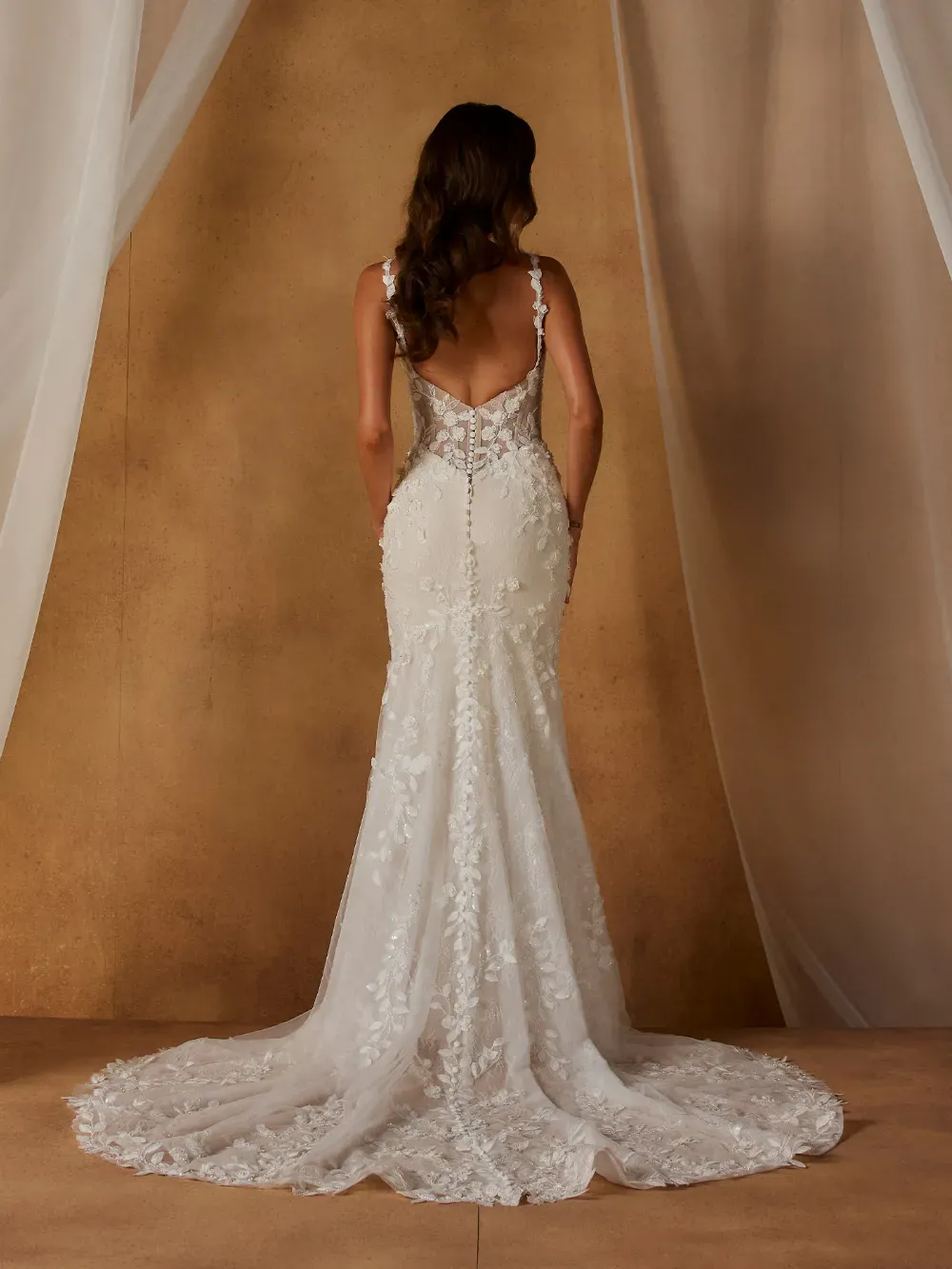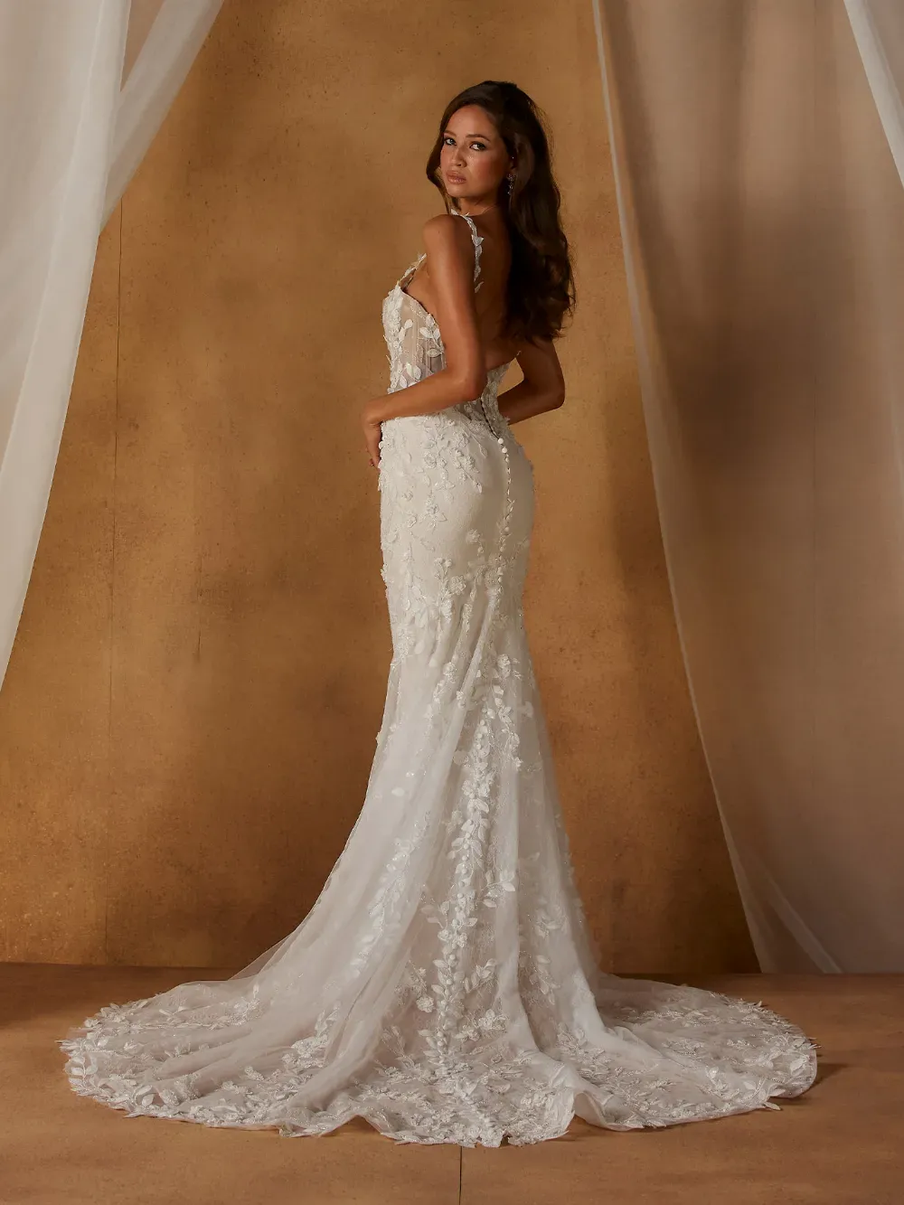 Romantic and richly detailed, Nial by Madi Lane Bridal celebrates feminine elegance through sculpted shaping and luminous lace. Designed to captivate from every angle, she blends softness with refined structure.