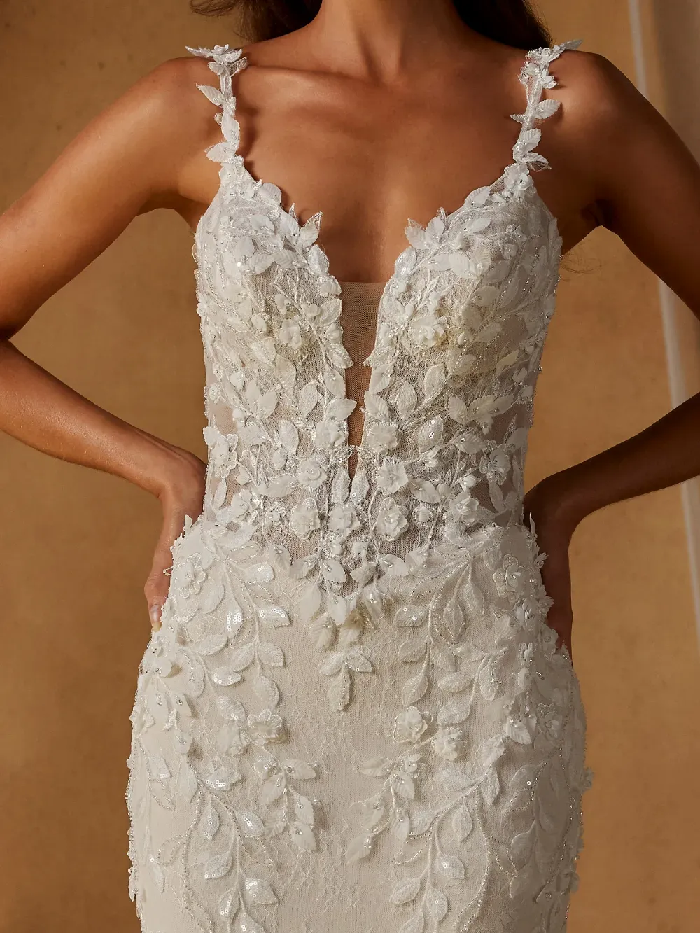 - Plunging V-neckline and beaded floral shoulder straps for subtle sparkle