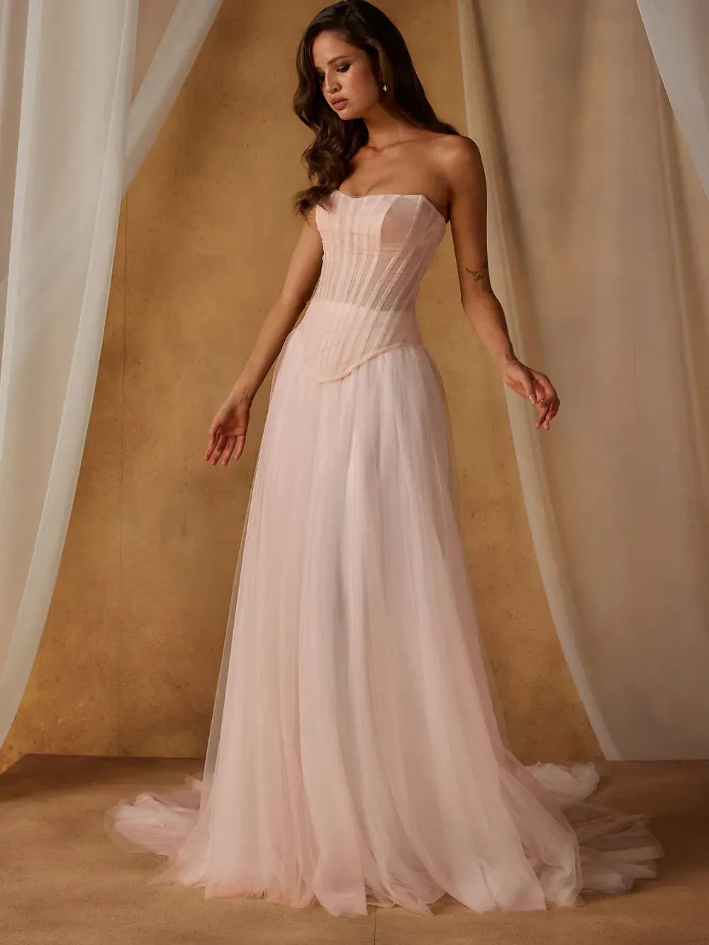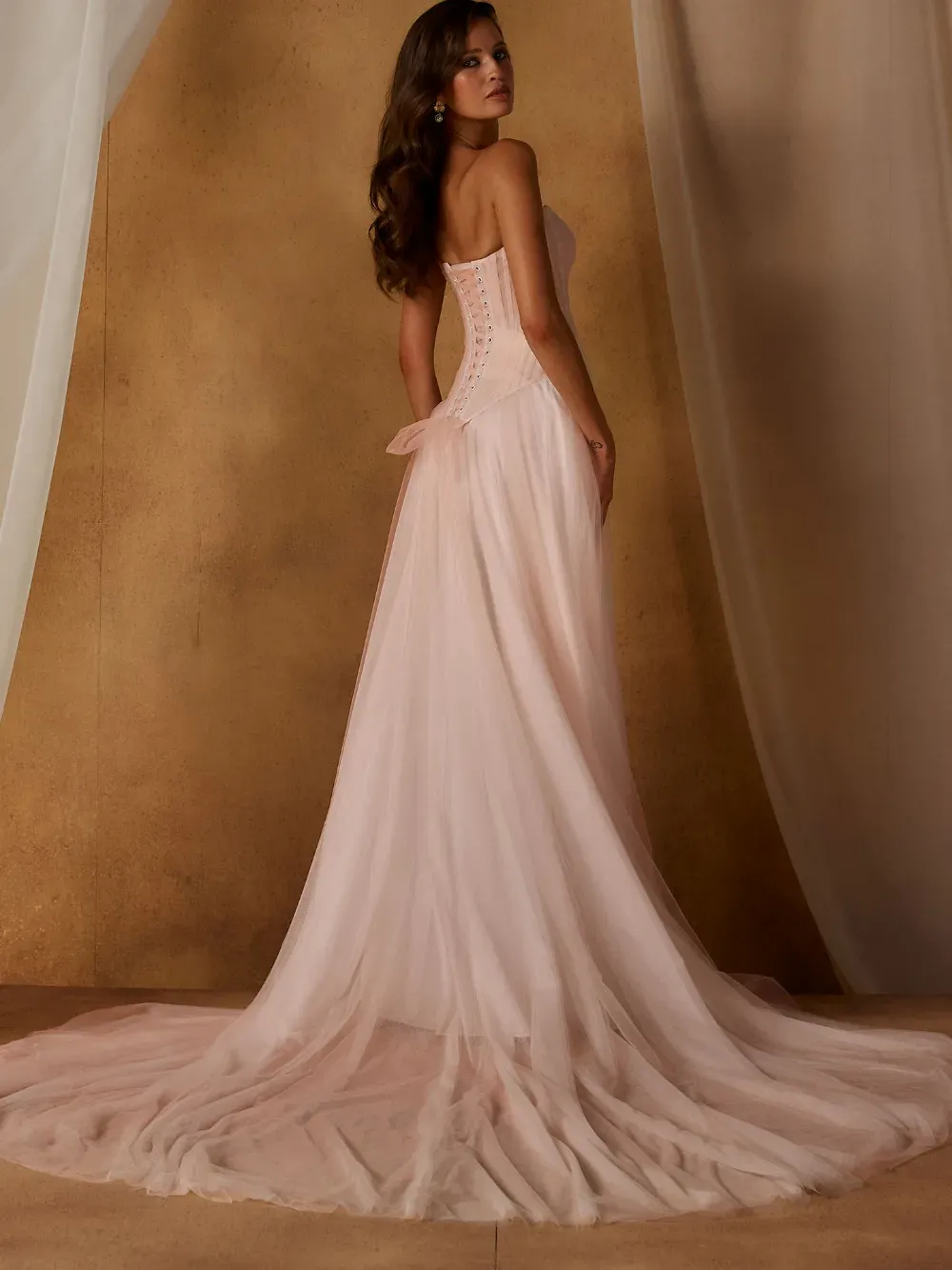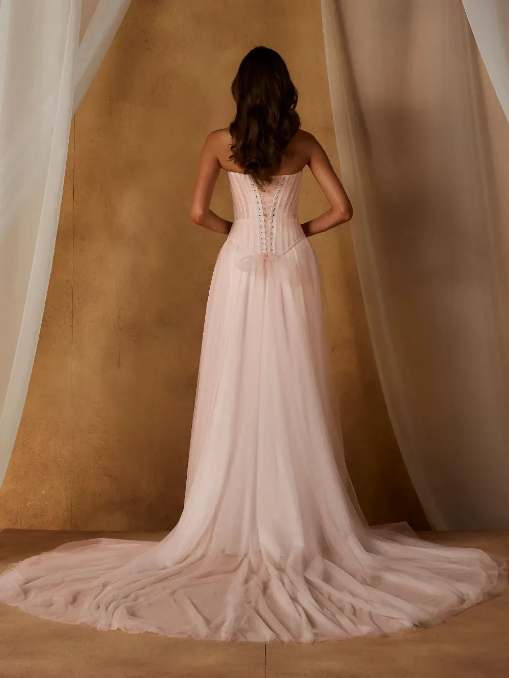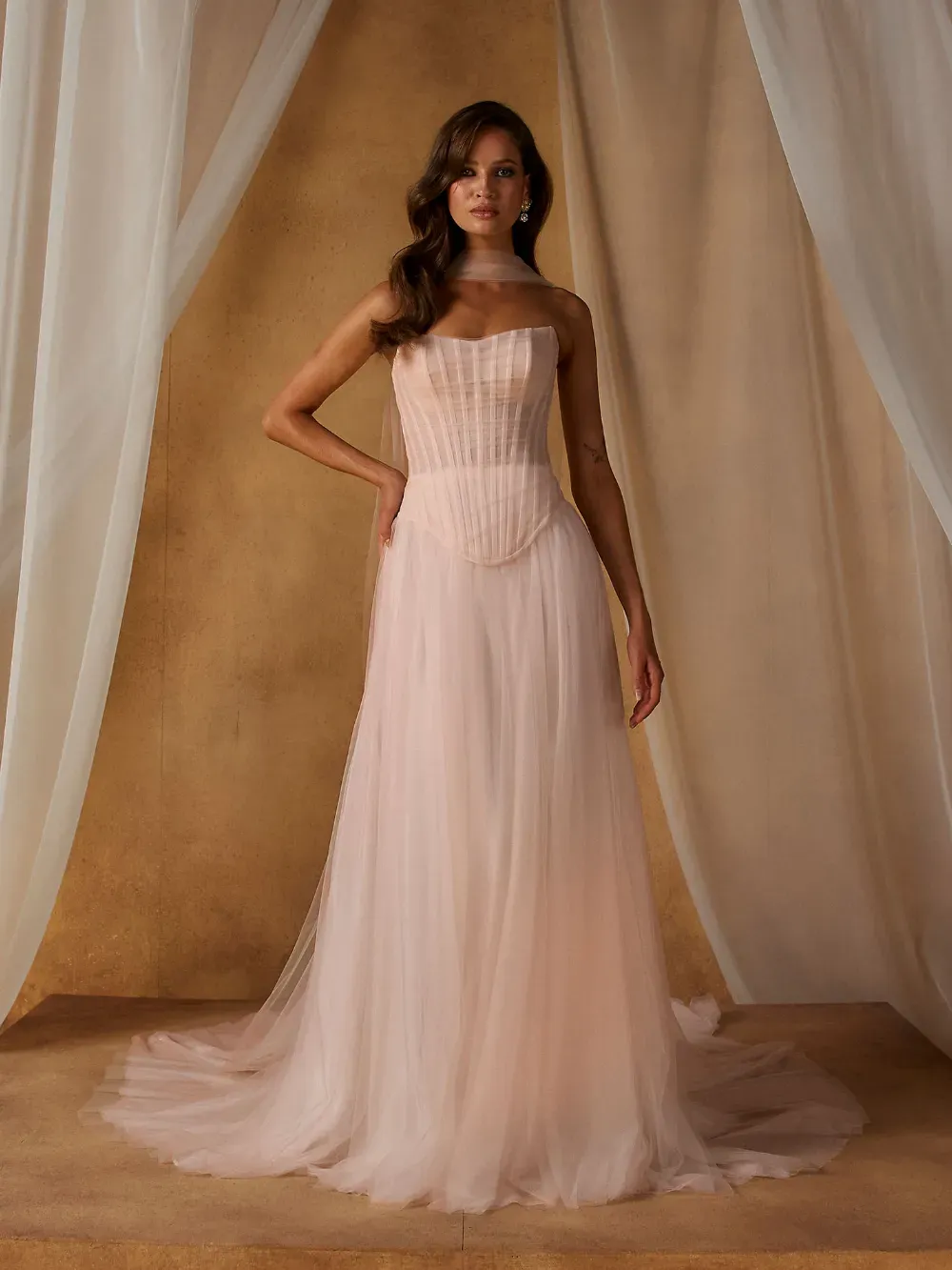 - Gathered tulle at the waist for gentle volume and flowing movement