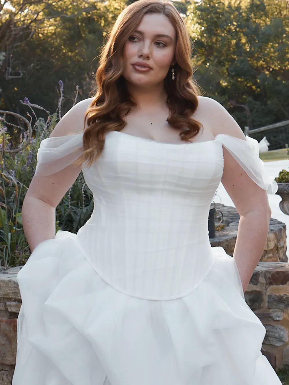 Playful yet refined, the Nickel Bodice by Madi Lane Bridal offers a contemporary corsetry look with romantic texture. Designed for versatility, she allows brides to personalize their bridal style.