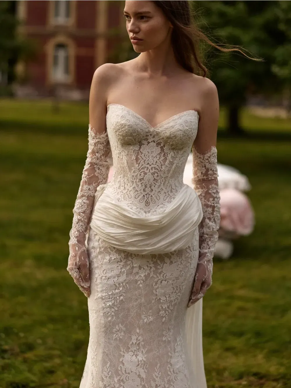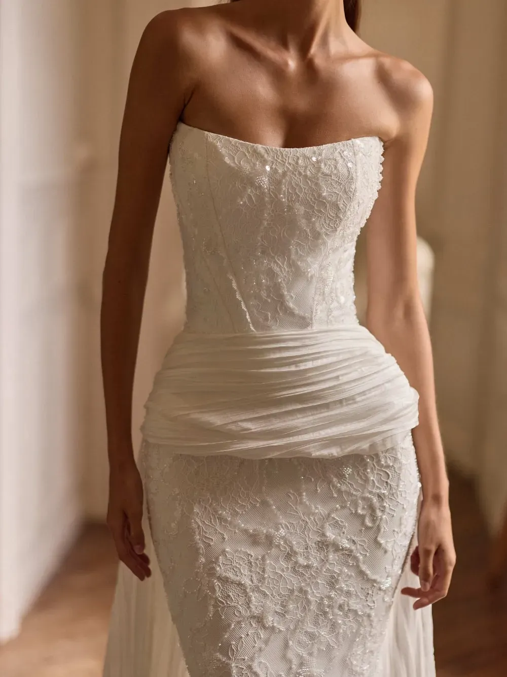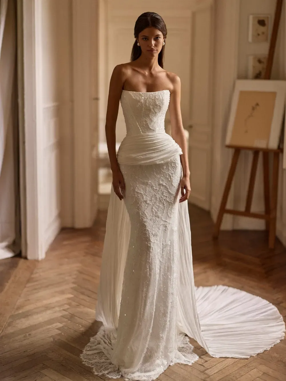 Designed to accentuate the hips and elongate the silhouette, the Evolis Train brings instant impact from ceremony to aisle moment. Its versatile design allows it to pair seamlessly with a range of gown styles, offering brides a refined way to personalize their bridal ensemble.