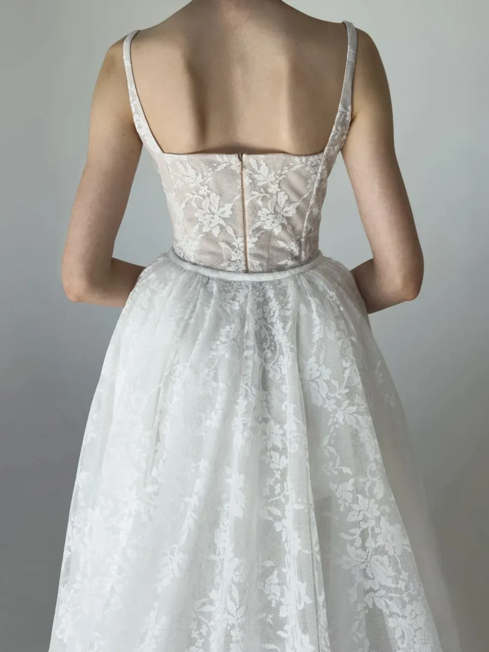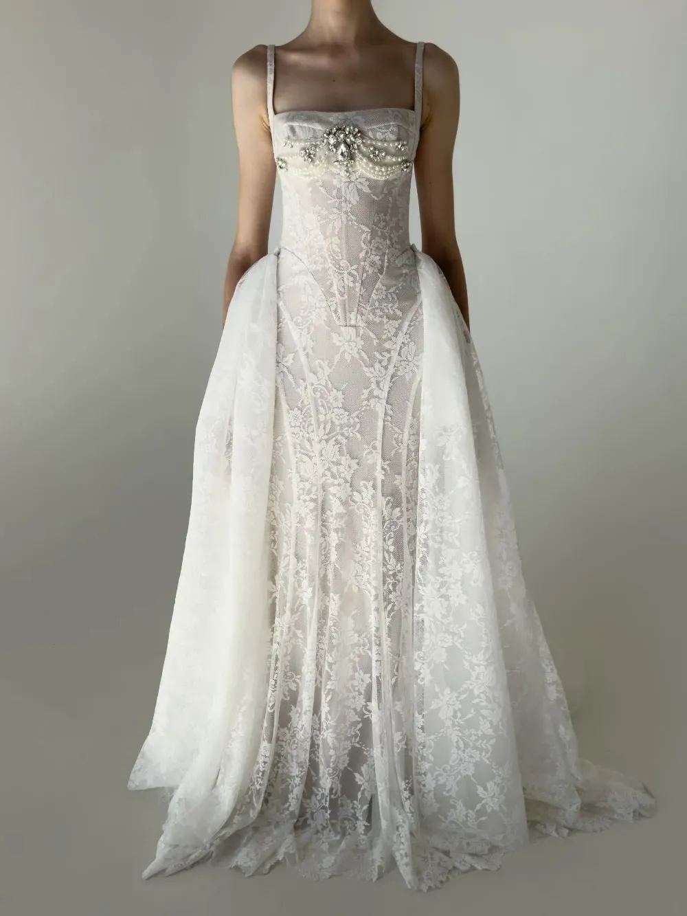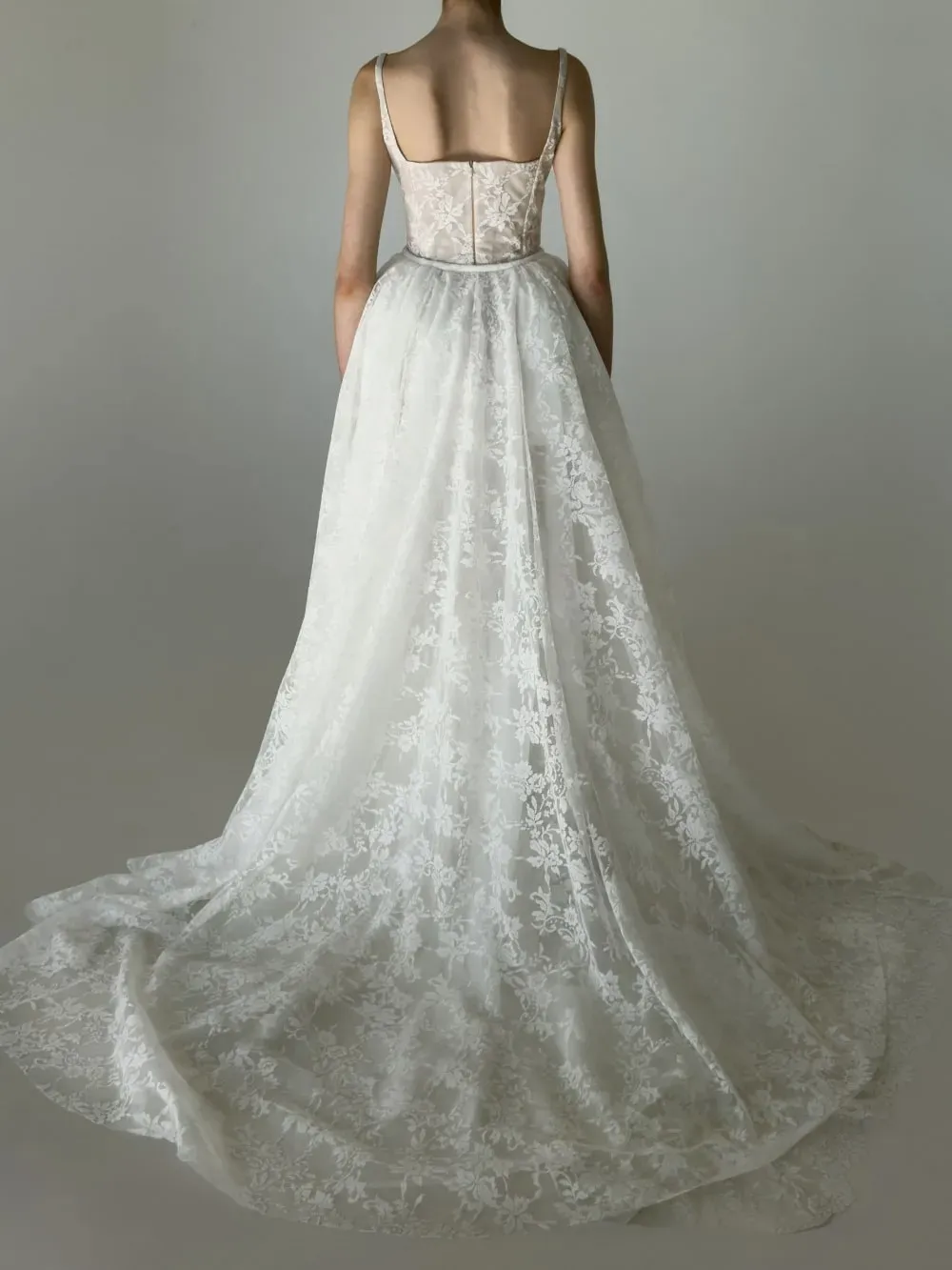 The Glowline train adds dimension and romantic drama to any bridal silhouette. Crafted from Chantilly lace, it drapes gracefully along the sides to accentuate the hips, flowing longer at the back for a subtle sense of bygone-era romance, ideal for the bride who loves elegant movement and vintage charm.